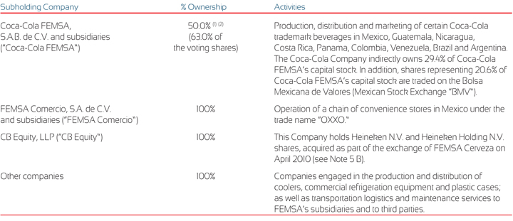 Fomento Económico Mexicano, S.A.B. de C.V. ("FEMSA") is a Mexican holding company. The principal activities of FEMSA and its subsidiaries (the "Company"), as an economic unit, are carried out by operating subsidiaries and grouped under direct and indirect holding company subsidiaries (the "Subholding Companies") of FEMSA.