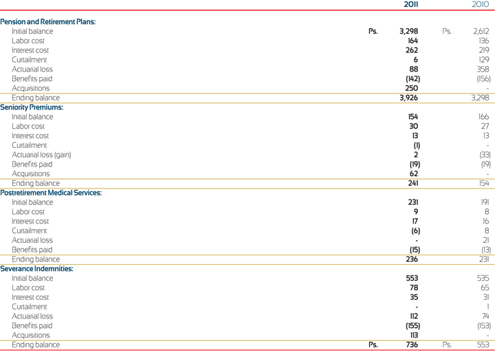 e) Changes in the Balance of the Obligations for Employee Benefits: