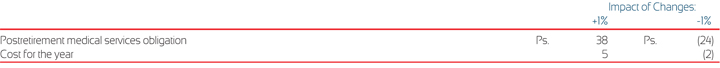 The following table presents the impact to the postretirement medical service obligations and the expenses recorded in the income statement with a variation of 1% in the assumed health care cost trend rates.