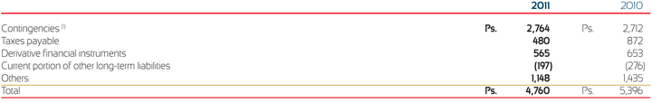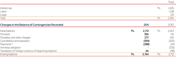 (1) As of December 31, 2010 included Ps. 560 of tax loss contingencies regarding indemnification accorded with Heineken over FEMSA Cerveza, prior tax contingencies, of which Ps. 113 were recognized as other current liabilities and Ps. 2 were cancelled as of December 31, 2011.