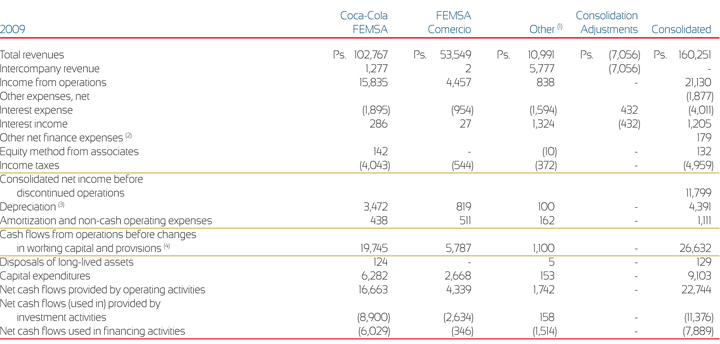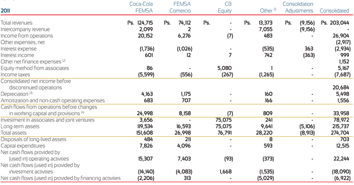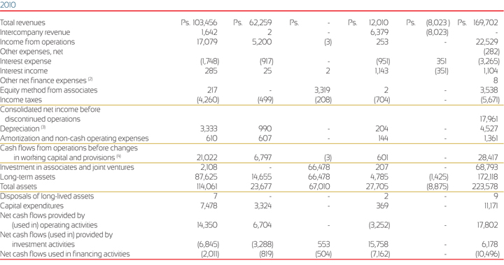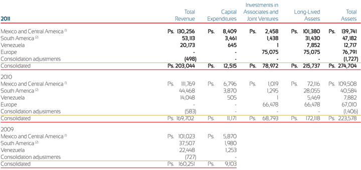 (2) South America includes Brazil, Argentina, Colombia and Venezuela, although Venezuela is shown separately above. South America revenues include Brazilian revenues of Ps. 31,405, Ps. 27,070 and Ps. 21,465 during the years ended December 31, 2011, 2010 and 2009, respectively. Brazilian long-term assets were Ps. 15,618 and Ps. 14,410 as of December 31, 2011 and 2010, respectively. South America revenues also include Colombian revenues of Ps. 12,320, Ps. 11,057 and Ps. 9,904 during the years ended December 31, 2011, 2010 and 2009, respectively. Colombian long-term assets were Ps. 12,855 and Ps. 11,176 as of December 31, 2011 and 2010, respectively.
