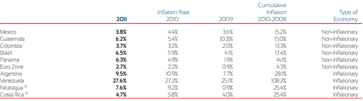 (1) Costa Rica and Nicaragua have been considered inflationary economies in 2009, 2010 and 2011. While the cumulative inflation for 2008-2010 was less than 26%, inflationary trends in these countries continue to support this classification.