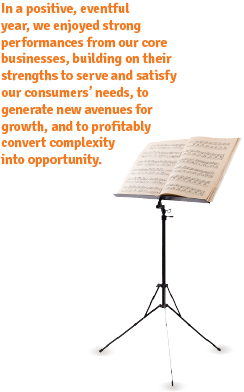 2012 was a positive, eventful year for our company. We again enjoyed strong performances across our core businesses, driven by their strengths to serve and satisfy our consumers' needs, to generate new avenues for growth, and to profitably convert complexity into opportunity. In addition, through our 20% economic interest in Heineken, we continued to benefit from the positive evolution of our investment as the company again made great progress in the execution of its global strategy. Through its consolidation of Asia Pacific Breweries, Heineken becomes an even more diversified global brewer, with an increasing presence in fast growing markets.