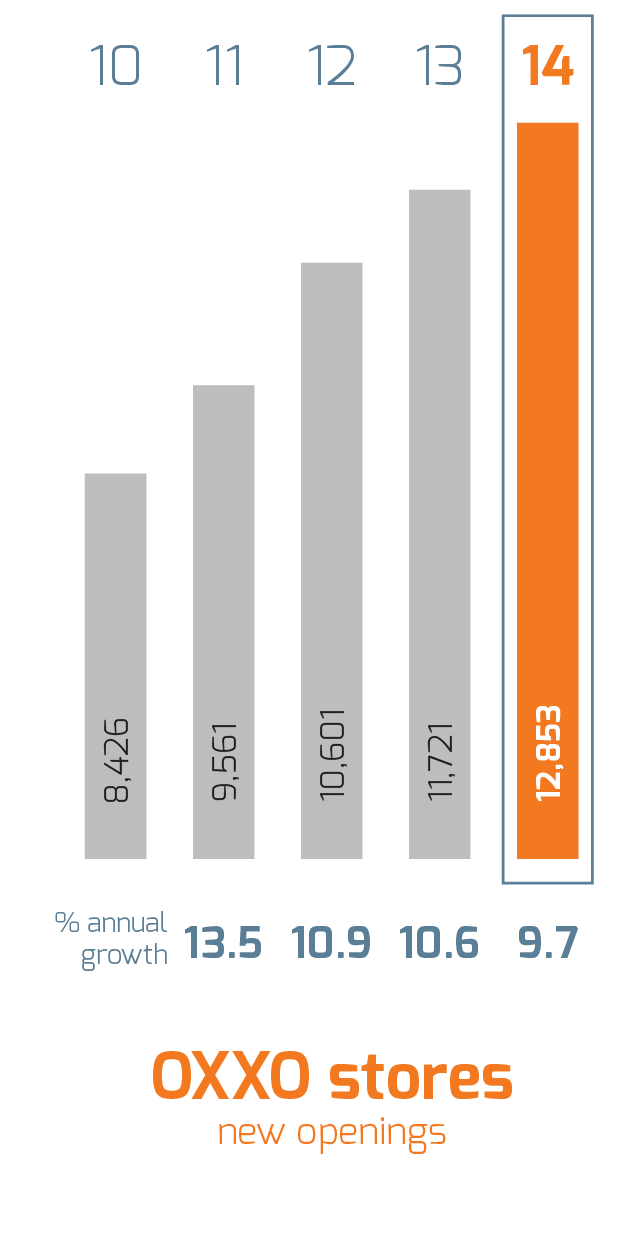 We managed to navigate significant headwinds to produce same-store sales growth of 2.7%—outperforming the rate of growth of our industry. In addition to our same-store sales growth, we continued with our long-term strategy to expand OXXO’s leadership position as Mexico’s largest and fastest growing modern small-format store chain. In 2014, we opened a record 1,132 new stores for a total of 12,853 stores in Mexico and Colombia.
