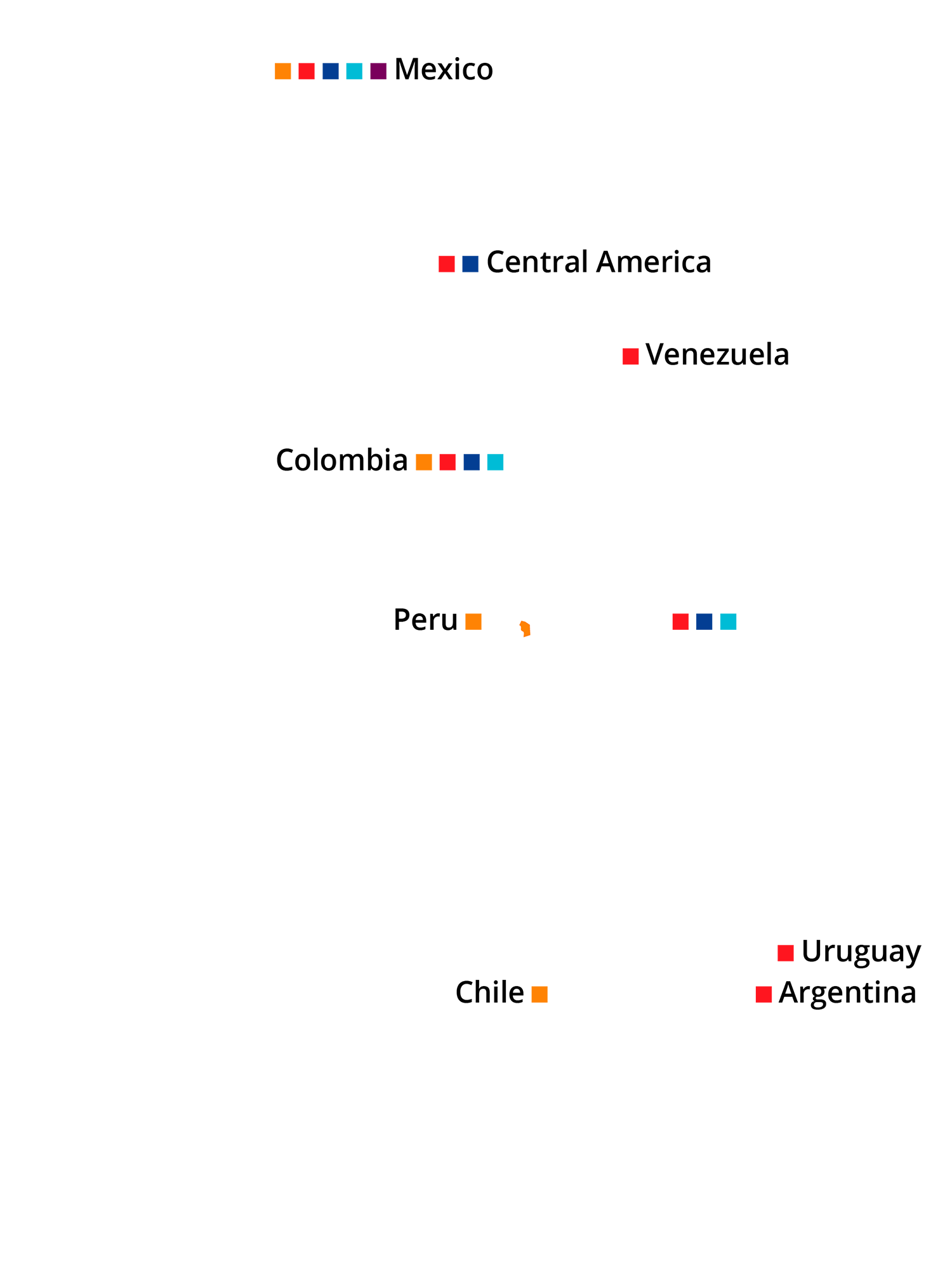 Argentina, Brazil, Chile, Colombia, Costa Rica, Guatemala, Mexico, Nicaragua, Panama, Peru, Uruguay and Venezuela.